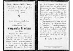 Mitgl. Mütterverein; schwere Krankheit; ∞ 21.4.1927 Josef Franken aus Rath b. Bedburdyck; 1 Sohn; Druck in Giesenkirchen |