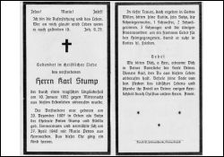 Tod durch Unglücksfall; Eltern: Anton Stump u. Sibilla geb. Zimmermann; ∞ 27.4.1940 Maria Peters aus Hemmerden; 1 K.; Druck in Grevenbroich |