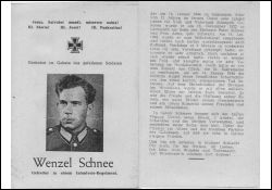 Gefallener 2. Weltkrieg; Eltern: Peter Schnee u. Anna geb. Schwartz; 16.1.1942 eingezogen; 9 Monate an der Front; erkrankte; nach Genesung erneut an die Front (Nordabschnitt); Ehrenfriedhof Woitolowa |
