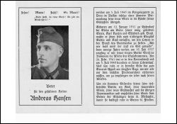Gefallener 2. Weltkrieg; Eltern: Karl Hansen u. Elisabeth geb. Deuß; ∞ 19.7.1937 Christine Bodewein; 1 Kind; 26.2.1941 Heeresdienst |