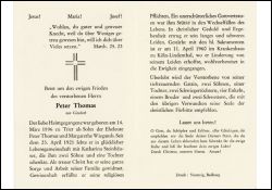 Eltern: Peter Thomas u. Margarethe geb. Wiegands; ∞ 23.4.1921 Katharina Steinhäuser, 3 Kinder; Wohnort Gindorf; langes, schweres Leiden |