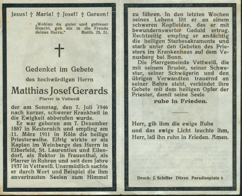 Pfarrer; 11.3.911 Priesterweihe Köln; Kaplan in Elberfeld, Eilendorf; Rektor in Frauemthal; Pfarrer in Rohren, Vettweiß |