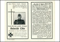 Obergefreiter Artillerie; Eltern: Peter Cöln und Elisabeth Mörs; ∞ 6.8.1938 Adele Berchem; 1K.; Gefallener 2. Weltkrieg |