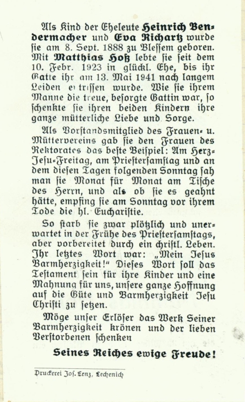 Eltern: Heinrich Bendermacher und Eva Richartz; ∞ 11.2.1923 Matthias Hoß † 13.5.1941; Opfer 2. Weltkrieg |