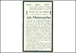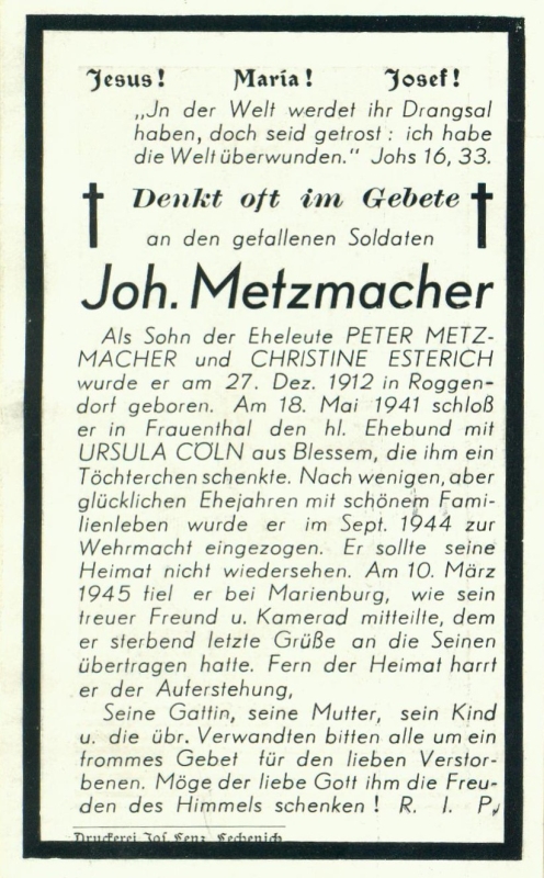 Eltern: Peter Matzmacher und Christine Esterich; ∞ 18.5.1941 Ursula Cöln; 1. K.; Gefallener 2. Weltkrieg |