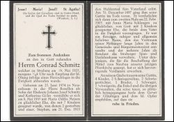 Eltern: Johann Josef Schmitz u. Katharina geb. Gilles; ∞ 8.5.1885 Maria Odilia Meisen, † 31.12.1897, 7 Kinder, davon 2 † und Sohn Stephan am 21.12.1915 im 1. Weltkrieg gefallen; ∞ 22.2.1903 Anna Maria Schlangen, 2 Kinder, beide †; Rendant der Straberger Spar- u. Darlehnskasse; Mitgl. Gemeinde- u. Bürgermeistereirat |