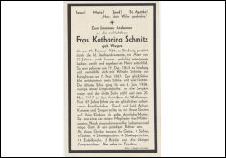 ∞ 7.5.1887 Wilhelm Schmitz aus Evinghoven, 10 Kinder, der älteste Sohn am 4.6.1904 durch Unfall †, der dritte Sohn seit 20.11.1917 im 1. Weltkrieg vermisst; Mitgl. Mütterverein |