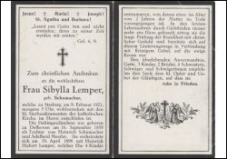 Eltern: Heinrich Schumacher u. Adelheid geb. Messler; ∞ 19.4.1898 Heinrich Hubert Lemper, 4 Kinder, davon 1 mit 2 J. †; durch Gichtleiden zuletzt ans Haus gefesselt |