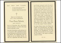 Eltern: Konrad Schmitz u. Odilia geb. Meisen; ∞ 9.9.1922 Zachäus Schmitz, 2 Kinder, Sohn Konrad am 23.1.1945 im 2. Weltkrieg gefallen |
