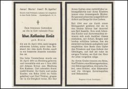 ∞ 1.6.1902 Johann Kreuz aus Masburg, Kr. Cochem, 12 Kinder, davon 5 Töchter †, 1 Sohn im 2. Weltkrieg gefallen; seit Schlaganfall 1944 gelähmt |