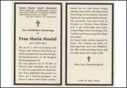 ∞ 26.9.1925 in Langenfeld Josef Musial, 6 Kinder, davon 2 bald †; sie hat sich immer schwer plagen müssen |