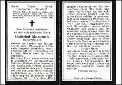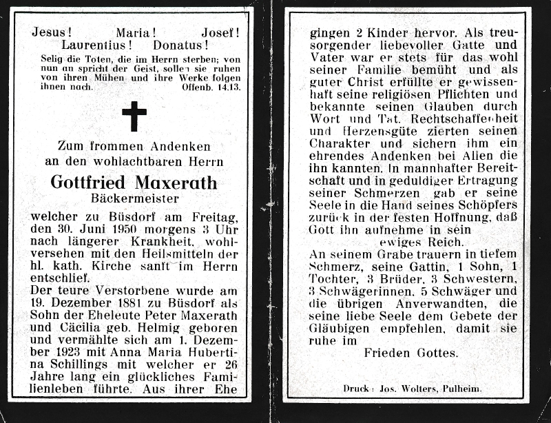 Bäckermeister; Eltern: Peter Maxerath u. Cäcilia geb. Helmig; ∞ 1.12.1923 Anna Maria Hubertina Schillings; 2 K.; längere, schmerzhafte Krankheit |