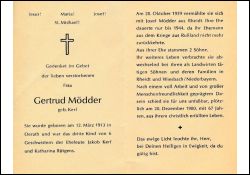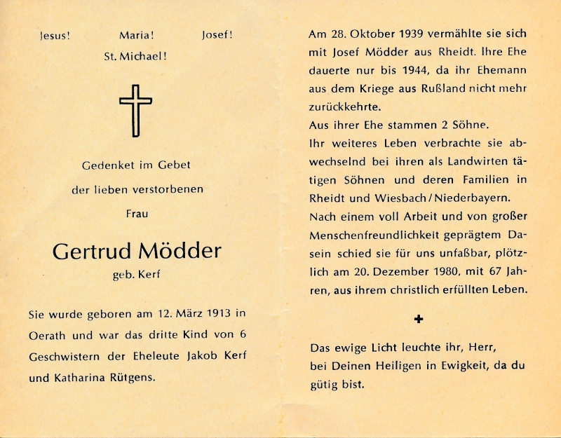 Eltern: Jakob Kerf u. Katharina geb. Rütgens; ∞ 28.10.1919, 1944 im 2. Weltkrieg in Russland gefallen; 2 Söhne; sie lebte bei ihren als Landwirte tätigen Söhne abwechselnd in Rheidt u. Wiesbach/Niederbayern |