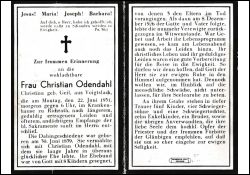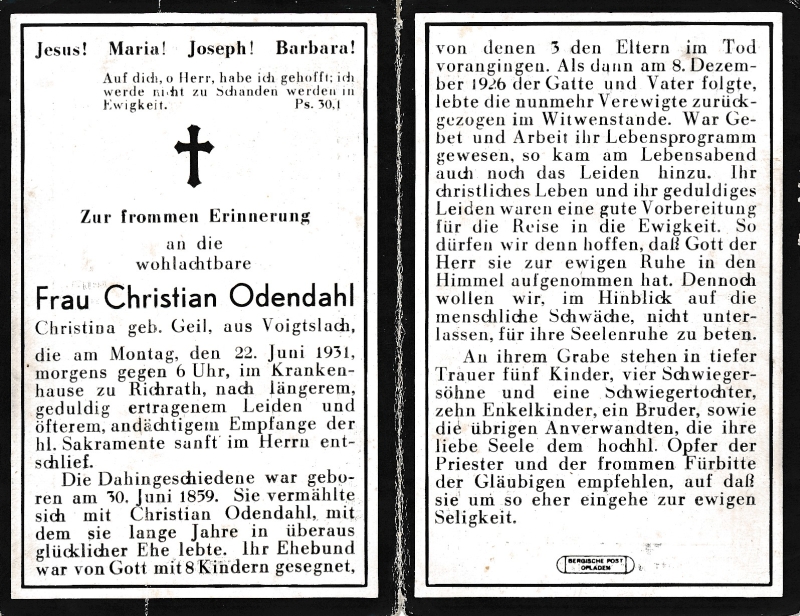 Längeres Leiden; Wohnort Voigtslach; ∞ Christian Odendahl, † 8.12.1926; 8 K., davon 3 †; Druck in Opladen |