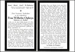 ∞ 8.10.1887 Wilhelm Opheys; 11 Kinder, davon 1 †; 6 Jahre Krankenlager, fast vollständig gelähmt, zuletzt viele Schmerzen; Druck in Dormagen |