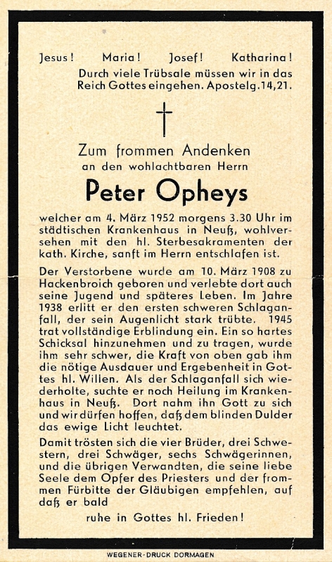 Lebte in Hackenbroich; 1938 1. Schlaganfall, der sein Augenlicht trübte; 1945 vollständige Erblindung; Tod nach 2. Schlaganfall |