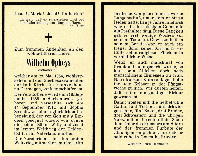 Posthalter i. R.; im 1. Weltkrieg durch Lungenschuss schwer verwundet, lebenslanges Leiden unter den Folgen; ∞ 14.9.1912 Sophia Schmitz; 7 Kinder, davon die beiden Söhne Willy u. Josef im 2. Weltkrieg gefallen; war viele Jahre lang Posthalter in Hackenbroich |