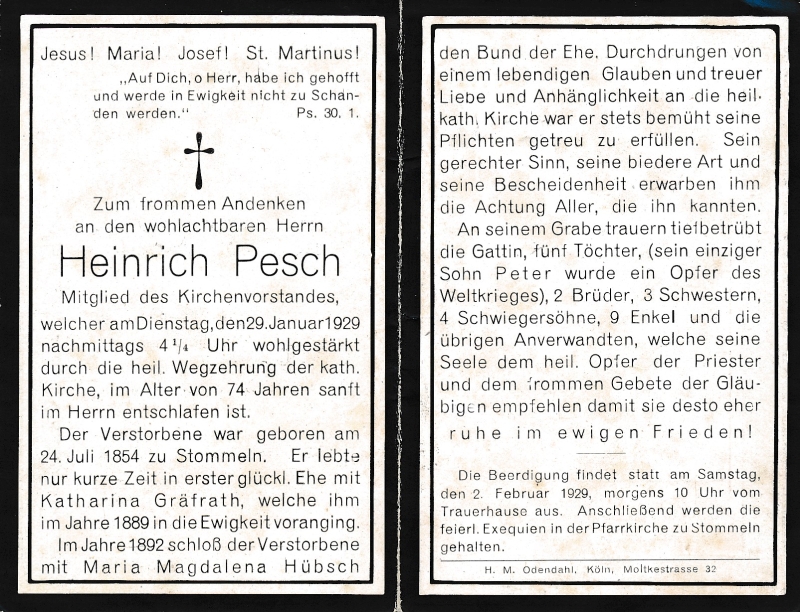 Mitgl. Kirchenvorstand; ∞ Katharina Gräfrath, bald darauf 1889 †; ∞ 1892 Maria Magdalena Hübsch; 5 überlebende Töchter, Sohn Peter im 1. Weltkrieg gefallen; |