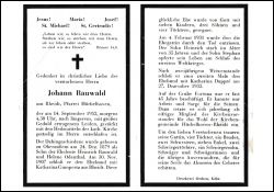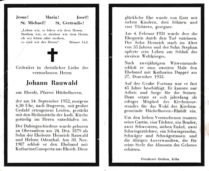 Längeres Leiden; Eltern: Heinrich Rauwald u. Helene geb. Odenthal; ∞ 30.11.1907 Katharina Gumpertz aus Rheid, † 4.2.1931t; 7 Kinder, Sohn Heinrich starb mit 35 J., Sohn Stephan im 2. Weltkrieg gefallen; ∞ 27.12.1933 Katharina Duppré; 45 J. auf Grube Fortuna beschäftigt; Mitgl. Kirchenvorstand |