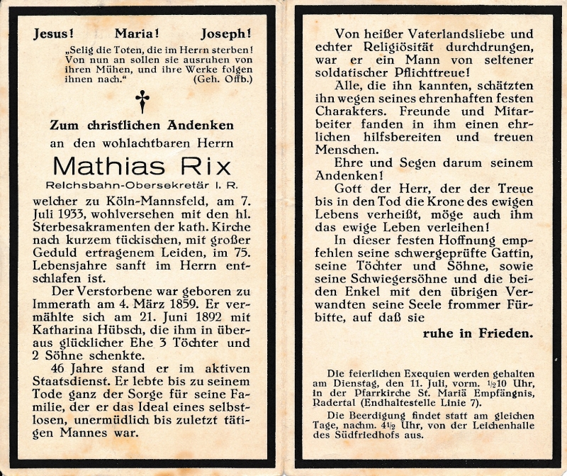 ∞ 21.6.1892 Katharina Hübsch; 5 Kinder; 46 J. im Staatsdienst; Exequien in Köln-Radertal |