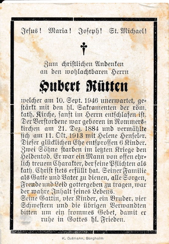 ∞ 11.10.1913 Helene Henseler; 6 Kinder, davon 2 Söhne im 2. Weltkrieg gefallen; Druck in Bergheim/Erft |