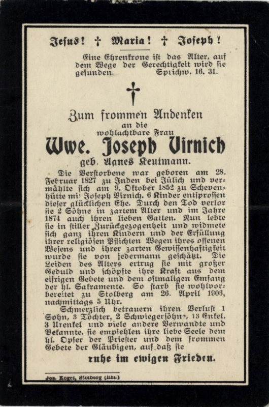 ∞ 9.10.1852 in Schevenhütte Joseph Virnich,† 1874; 6 K., davon 2 Söhne in zartem Alter †; |