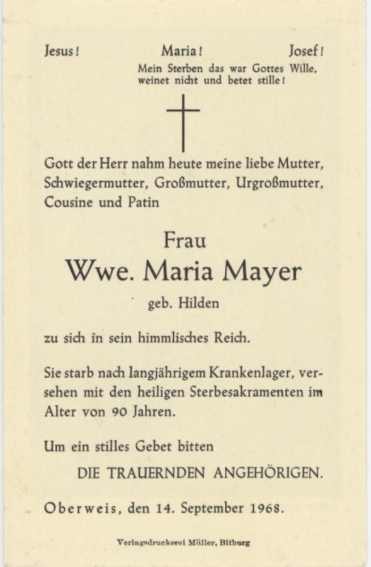 90 J.; Witwe; langjähriges Krankenlager, Druck in Bitburg