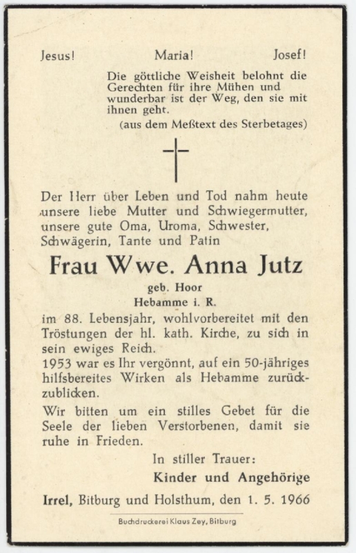 88 J., Herbamme i. R.; 1953 50-jähriges Berufsjubiläum als Hebamme; Druck in Bitburg |