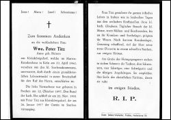 Aus Kleinkönigsdorf; ∞ 22.11.1931 Peter Titz aus Kleinkönigsdorf, † 26.1.1957; 1 überlebende Tochter |