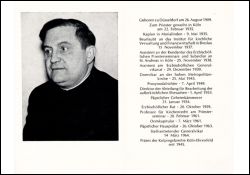 Prietserweihe Köln 22.2.1935; !935-37 Kaplan in Marialinden; 1943 Domvikar Köln; 1961 Professor für Kirchenrecht am Priesterseminar Köln; stellv. Generalvikar; Präses d. Kolpingfamilie Köln-Ehrenfeld |
