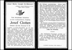 Eltern: Kaspar Clotten u. Katharina geb. Dohmen; mit 17 1/2 J. folgte er Ruf d. Vaterlandes, schwer verwundet, mit gebrochener Kraft Rückkehr aus Gefangenschaft; daraus 3 J. langes Leiden (Opfer 1. Weltkrieg) |