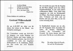 Eltern: Martin u. Anna Außem; ∞ 18.3.1941 Engelbert Willerscheidt in Hürth; 2 K.; Mitgl. Kirchenchor (Hürth) |