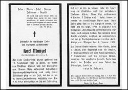 Eltern: Matthias Monzel u. Margarete geb. Braun; Schreinerausbildung; Postbetriebsassistent a.D.; ∞ 9.2.1907 Luise Klug; 4 K., 1 Sohn im 2. Weltkrieg am 12.9.1941 in Rußland gefallen (Bonn) |