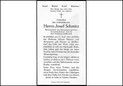 Eltern: Johann Schmitz u. Margarete geb. Simons zu Muffendorf; ∞ 1928 Maria Blum; langes, schweres Leiden (Druck in Bad Godesberg) |