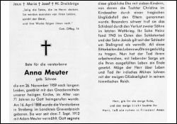 ∞ 7.9.1912 Adam Meuter; 7 K., davon Tochter Christine als Kind durch Unglücksfall †; Verlust zweier Söhne im 2. Weltkrieg: Sohn Heinz 1943 gefallen im Osten, Sohn Jakob bei Stalingrad vermißt |