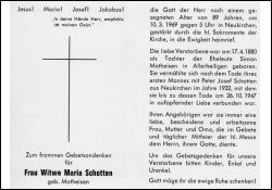 Eltern: Ehel. Simon Matheisen; ∞ (nach dem Tod des 1. Mannes) 1932 Peter Josef Schotten, † 26.10.1947; Kinder |