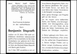 Eltern: Hubert Steprath u. Maria geb. Kruchen; ∞ 7.5.1907 Anna Schmitz vom Bergerhof b. Gohr; 5 K., davon 2 Söhne † (Gohr) |