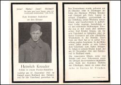 Gefallener 2. Weltkrieg; Eltern: Philipp Kreuder u. Gertrud geb. Dolz; Bruder Josef am 21.11.1941 in Rußland gefallen |