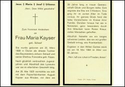 Eltern: Baumeister Johann Schaaf u. Franziska geb. Nipps; ∞ 26.5.1925 Papierfabrikanten August Kayser aus Winden; 39 J. Ehe; 3 K., davon 1 früh †; Mitarbeit beim Roten Kreuz; langes, schweres Leiden |