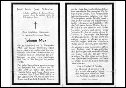 Eltern: Theodor Mux u. Anna Maria geb. Hartstein; ∞ 1.6.1900 Anna Maria Bayer aus Rheinfeld, † 4.10.1949; 8 K.; Mitgl. Kirchenvorstand St. Michael Dormagen |