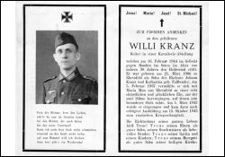 Gefallener 2. Weltkrieg; gefallen im Kampf gegen Banden (Partisanen); Eltern: Johann Kranz u. Katharina geb. Faßbender; ∞ 5.2.1937 Maria Mux aus Rheinfelden; 2 Söhne; eingezogen am 1.3.1943 |