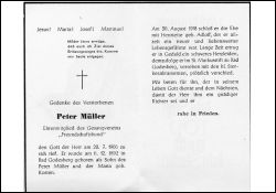 Eltern: Peter Müller u. Maria geb. Kosten; OO 30.8.1918 Henriette Adloff; schweres Herzleiden |