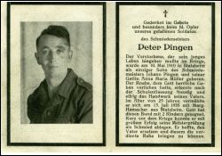 Gefallener 2. Weltkrieg; Eltern: Schmiedemeister Johann Pingen u. Anna Maria geb. Müller; erlernte Handwerk d. Vaters, Meister; OO 13.7.1935 Margarete Hamacher aus Blatzheim; 2 K.; Tod auf Flucht |