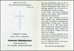 Eltern: Jakob Schlaghecken u. Johanna geb. Hansen; nach 1945 übernahm er kriegszerstörten elterl. Hof; OO 8.11.1949 Mine Theyßen aus Haldern/Sonsfeld, † 20.8.1961; 4 K. |