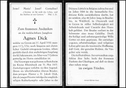 Jungfrau; 75 J.; 46 J. Haushalt ihres geistl. Bruders Jakob Dick geführt, in Brachelen, Waldbröl, Otzenrath u. Geyen; wg. Kulturkampfes war Bruder 8 J. in Diözese Lüttich, Belgien |