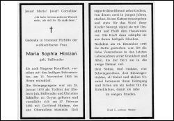 Eltern: Johann Faßbender u. Christine geb. Schieffer; ∞ 27.2.1892 Gottfried Hintzen aus Oberaußem, † 31.12.1944; 10 K., davon 2 früh †; Krankheit in den letzten Jahren (Geyen) |