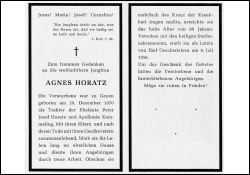 Jungfrau; Eltern: Peter Josef Horatz u. Apollonia Kemmeling (Kemmling); lebte auf dem Hof der Eltern und nach deren Tod der Geschwister; sie starb als letzte von 5 Geschwistern |