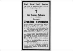 Jungfrau; Eltern: Christian Kaesmacher u. Margarethe geb. Horatz; nach dem Tod der Eltern führte sie als älteste der Geschwister das Hauswesen (Geyen) |