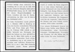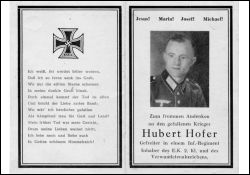 Gefallener 2. Weltkrieg; verwundet am 15.7.1943 b. Welikije-Luki; Eltern: Winand Hofer (†) u. Anna geb. Veiser; ∞ 21.2.1936 Käthe Spinrath aus Dormagen; Einberufung 21.3.1942; erstmals verwundet 1.5.1943 |