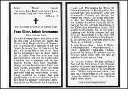 Selbst. Lebensmittelkauffrau; Eltern: Paul Rings u. Gertrud geb. Schieren; ∞ 14.2.1911 Jakob Hermanns, †; 6 K., davon 1 †; Vors. Frauen- u. Mütterverein in Gustorf; schwere, tückische Krankheit |